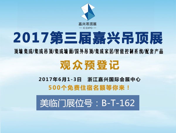 美臨門以“品質典范、美好生活”作為企業定位,希望能給您帶來美好的生活享受。2017年6月1日-3日,美臨門將亮相嘉興吊頂展,讓我們共同期待!